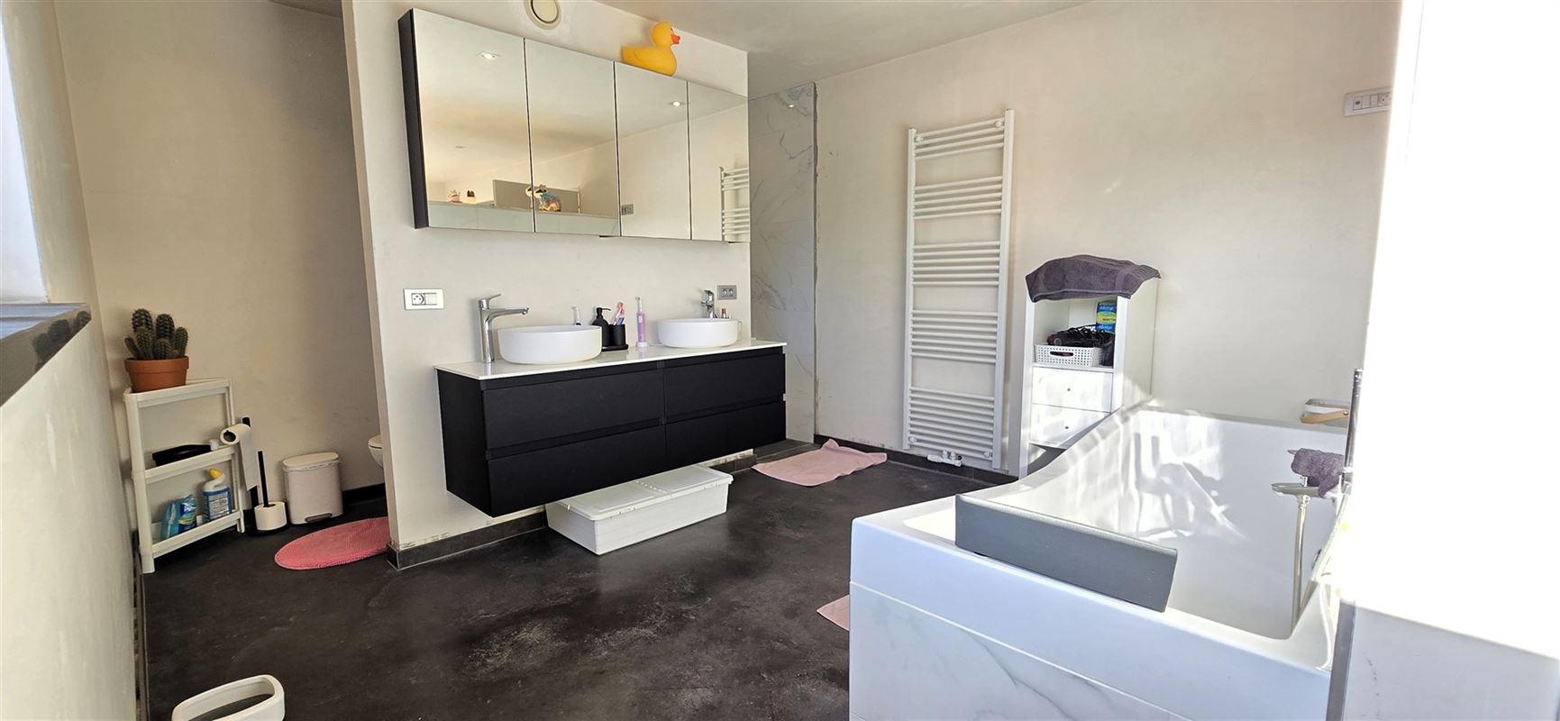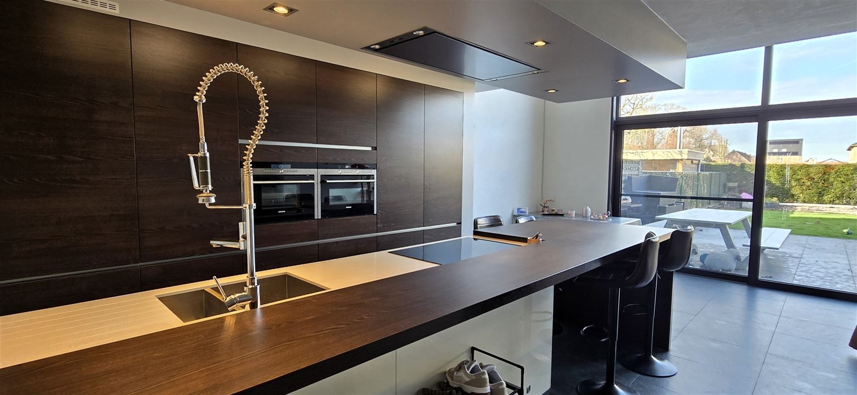 Gelijkvloers treffen we ook de garage aan met toegang tot de aangelegde tuin met terras.