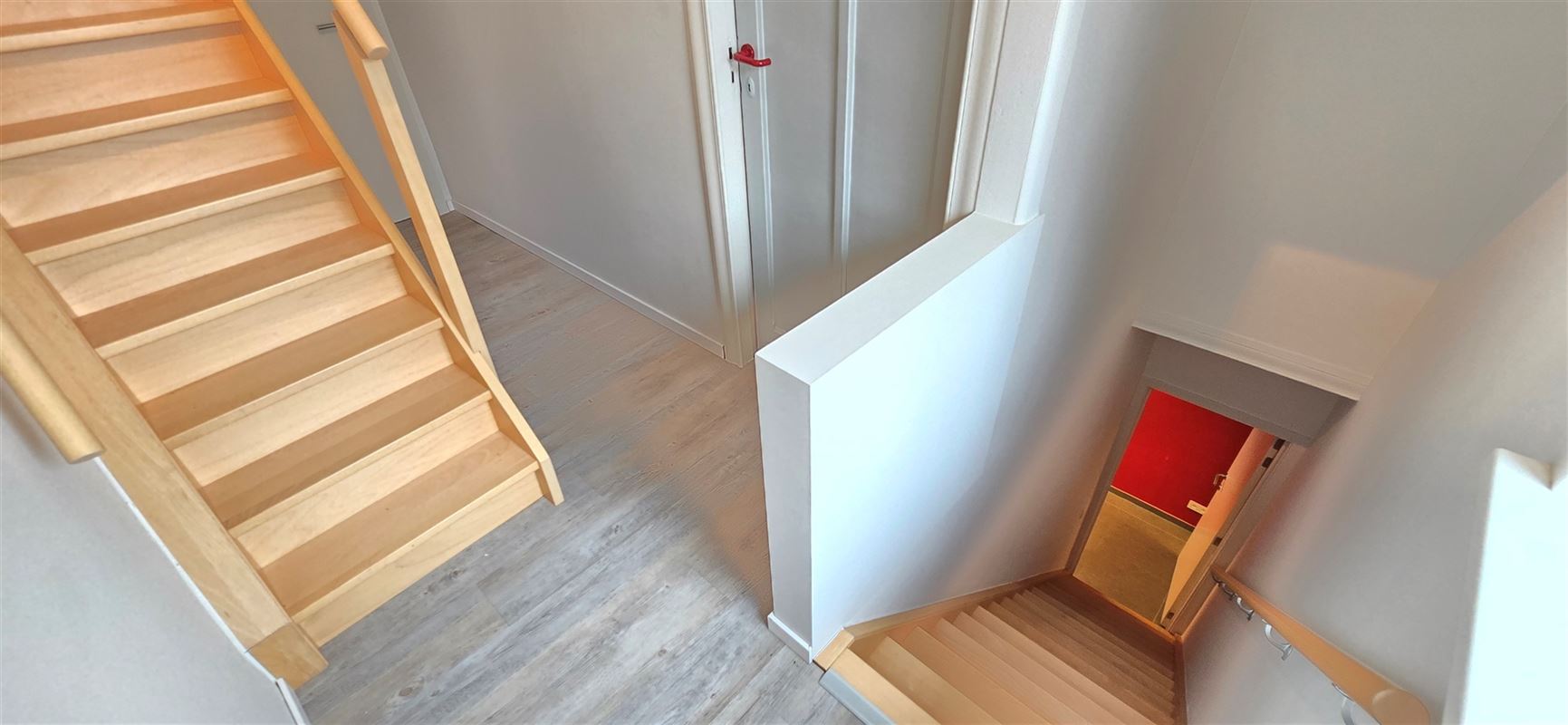 Vaste trap naar de zolderverdieping die ingericht is als vergaderzaal of groot kantoor.